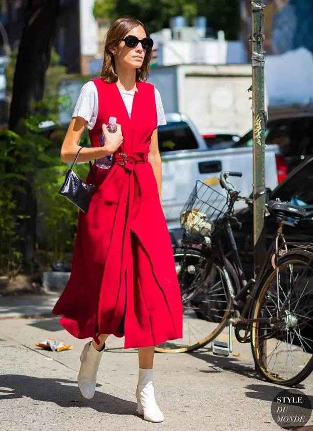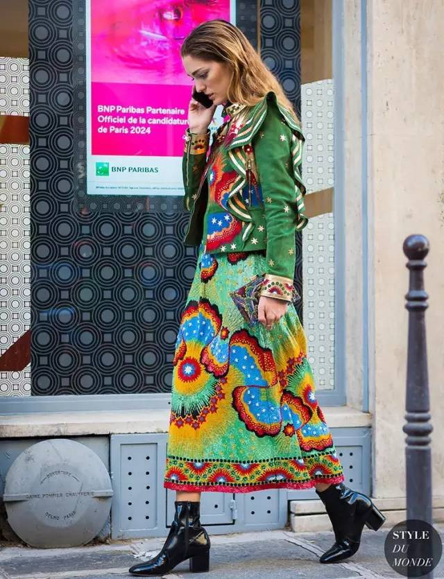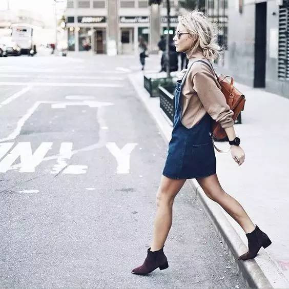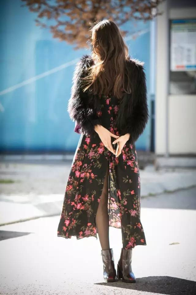 纯色的粗跟靴配上大花裙,露出脚踝,绝对让你在秋季的阳光下回头率满满。