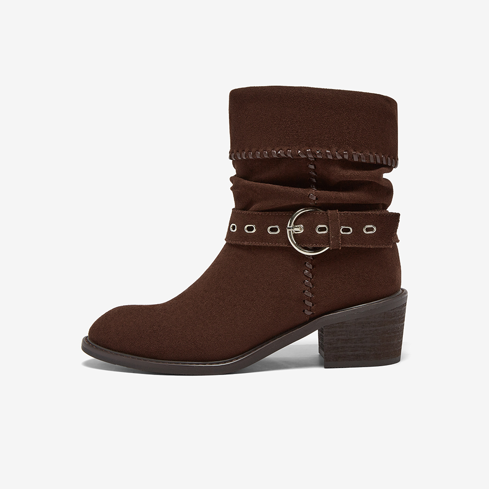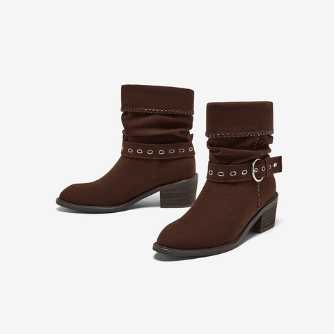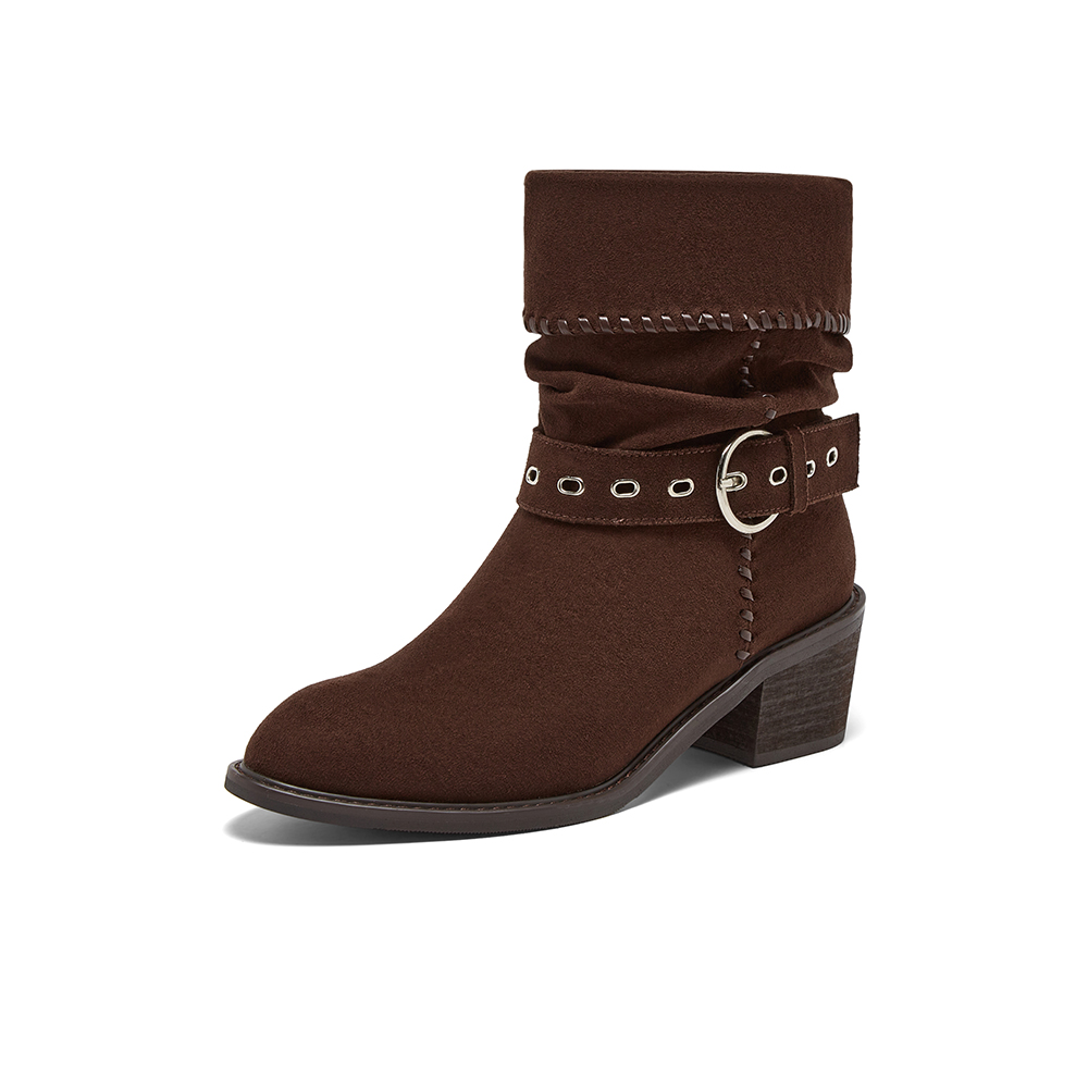 百思图2025冬季新款西部靴时尚潮流堆堆靴粗跟尖头女中靴B2732DZ5