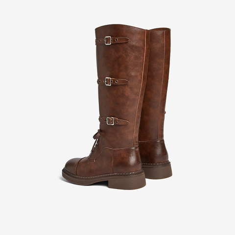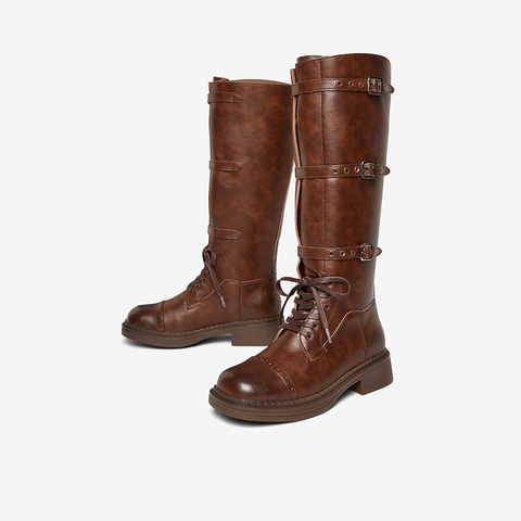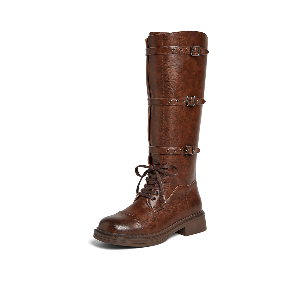 百思图2024冬季新款时尚复古街头骑士靴粗跟女长靴BG601DG4