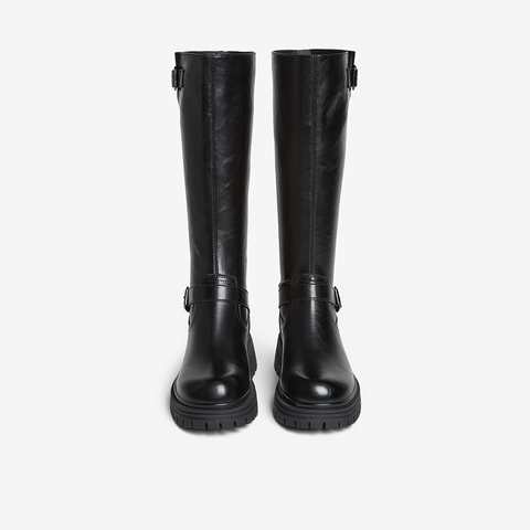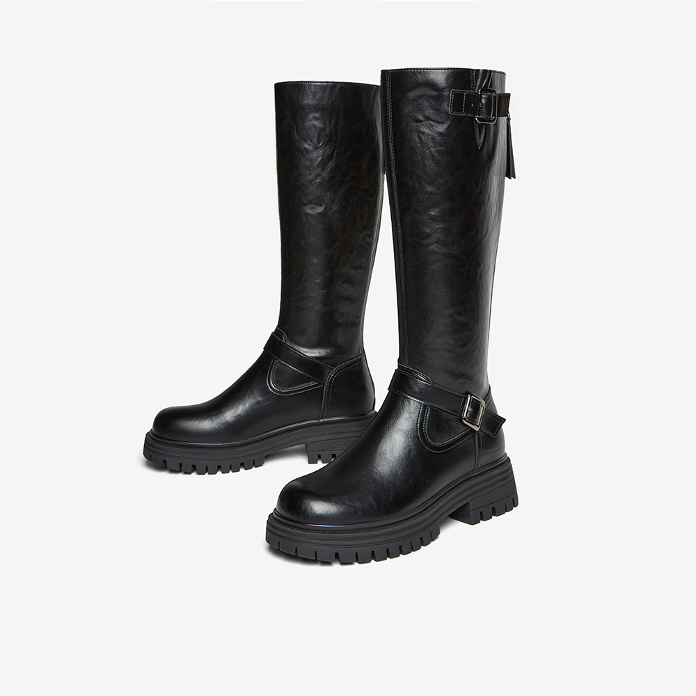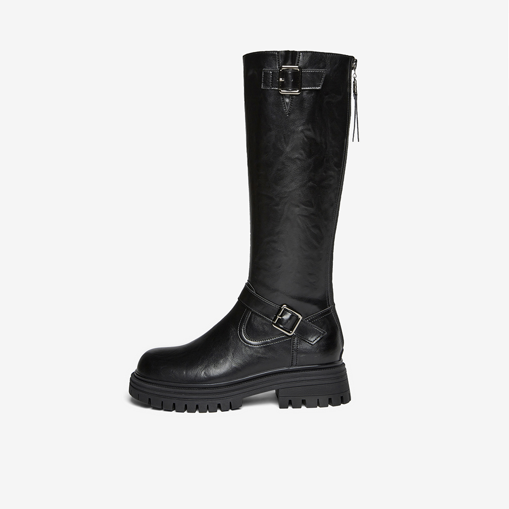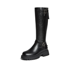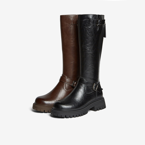百思图2025冬季新款骑士靴时尚街头潮流通勤粗跟女长靴F2032DG5