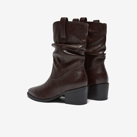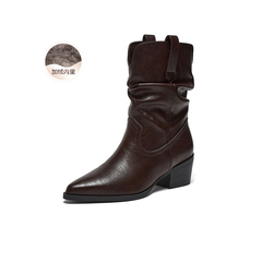 百思图2025冬季新款堆堆靴时装靴时尚潮流粗跟尖头女中靴F3061DZ5