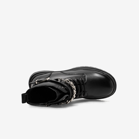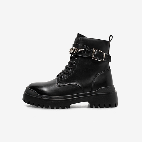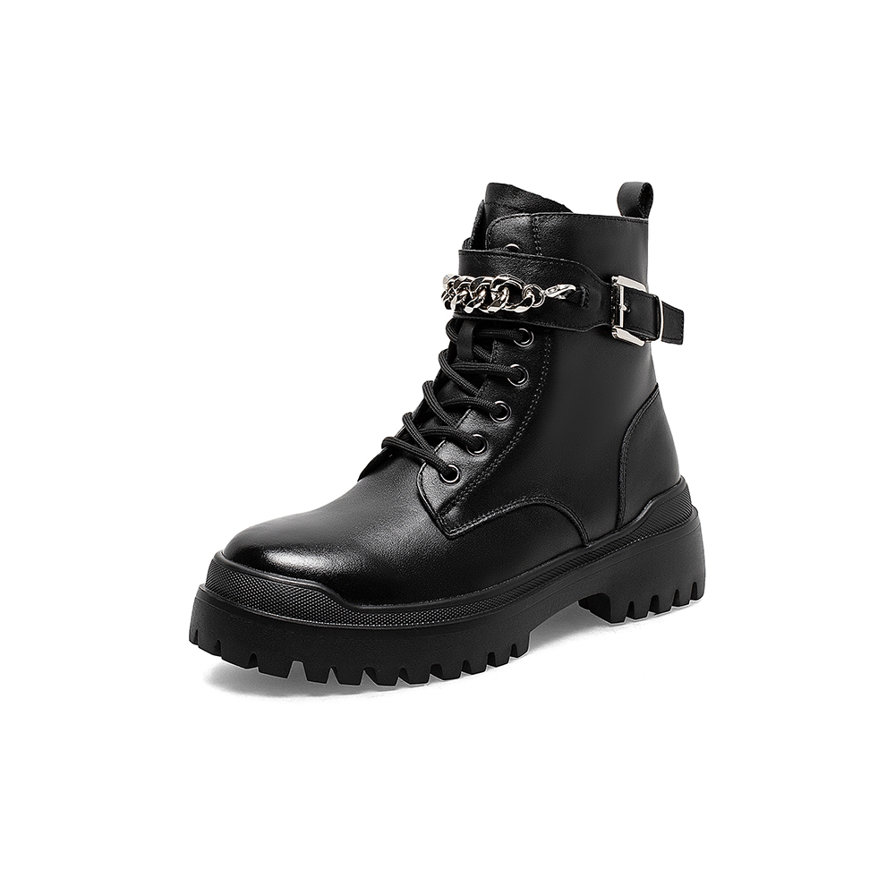 百思图2021冬季新款英伦风金属饰带圆头粗跟马丁靴女短靴FD500DD1