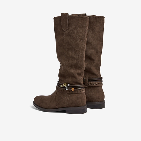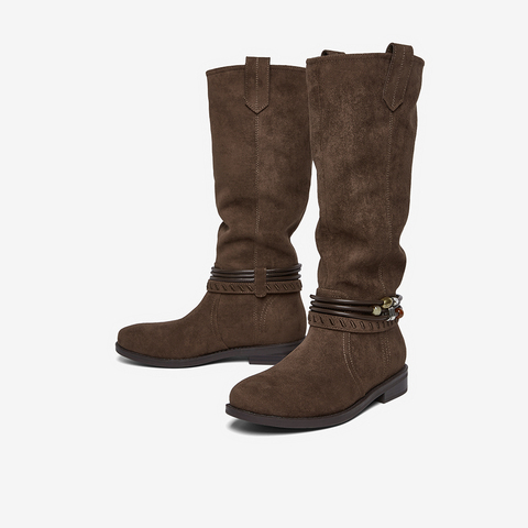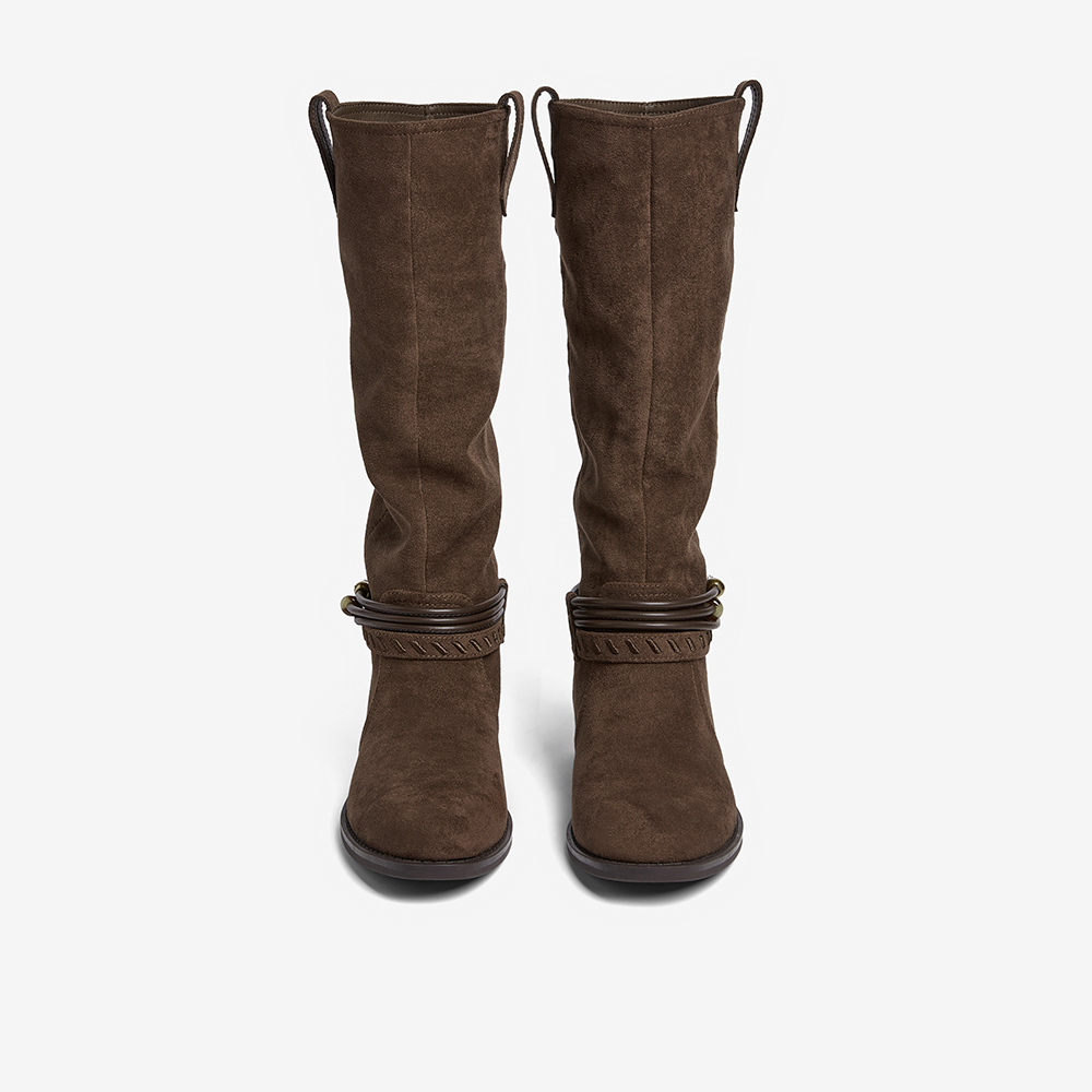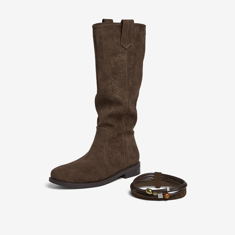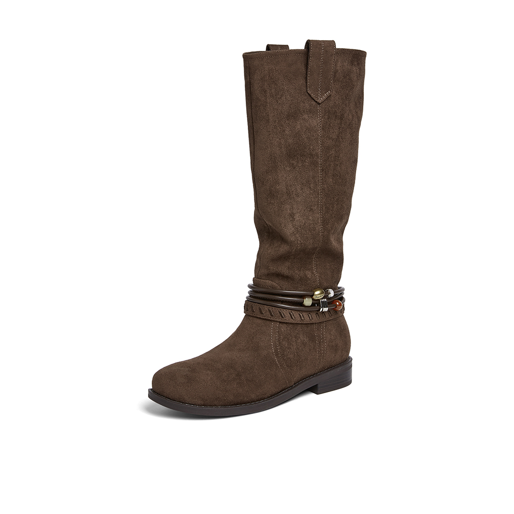 百思图2025冬季新款堆堆靴西部靴时尚复古女长靴W5862DG5