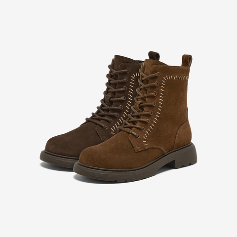 牛剖皮粗跟绒面百搭短筒靴