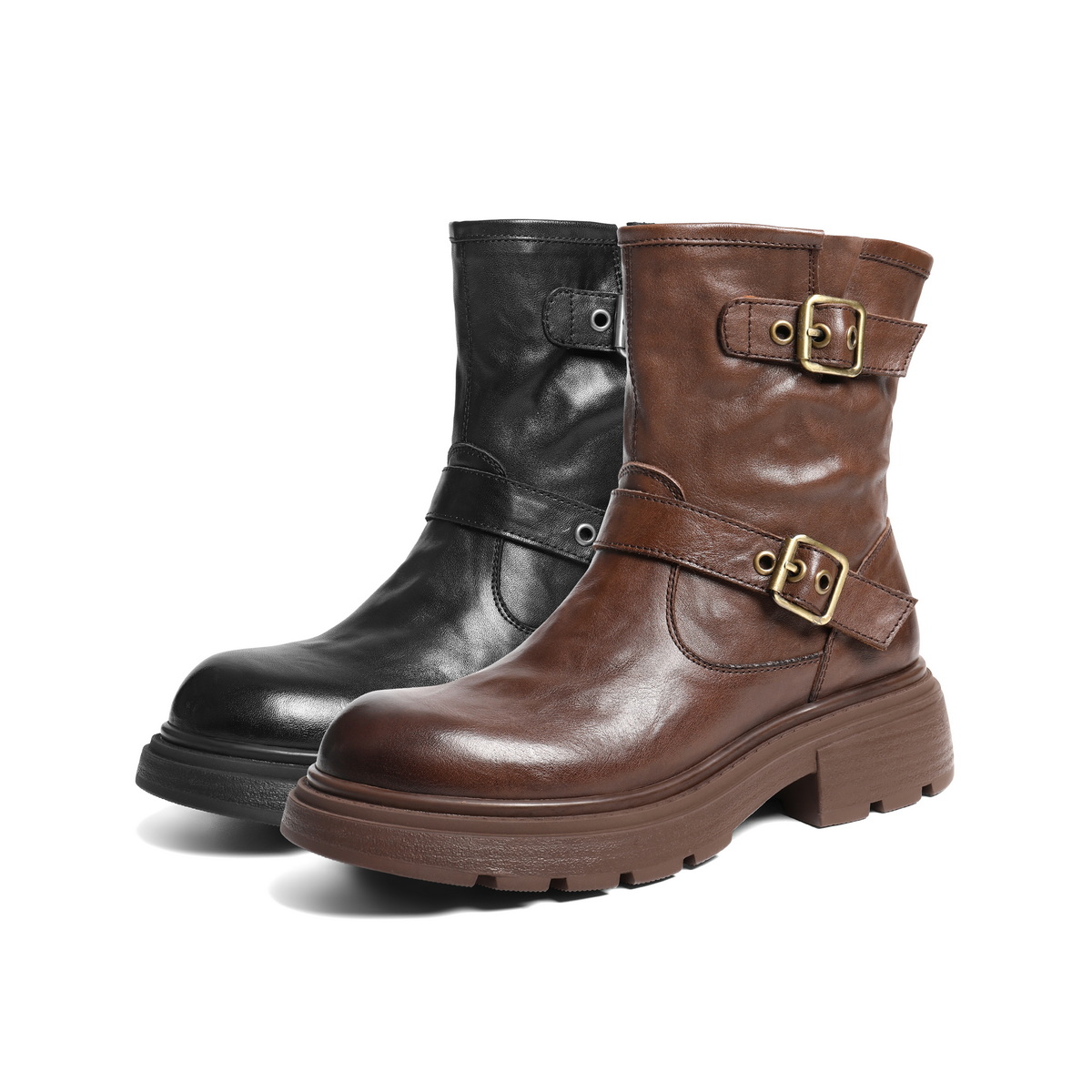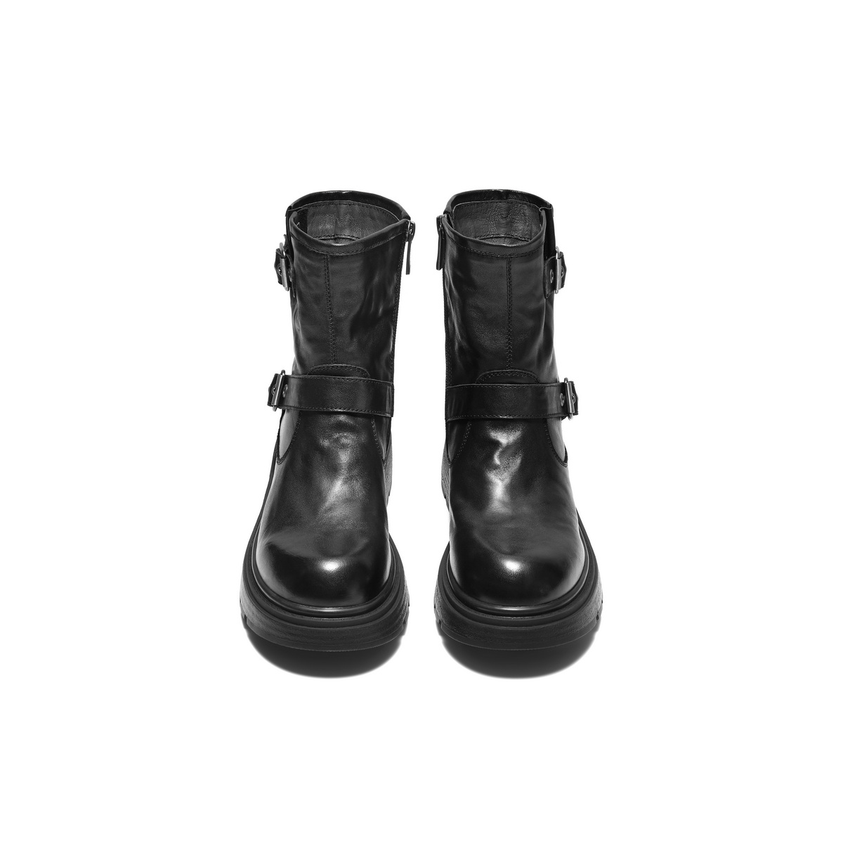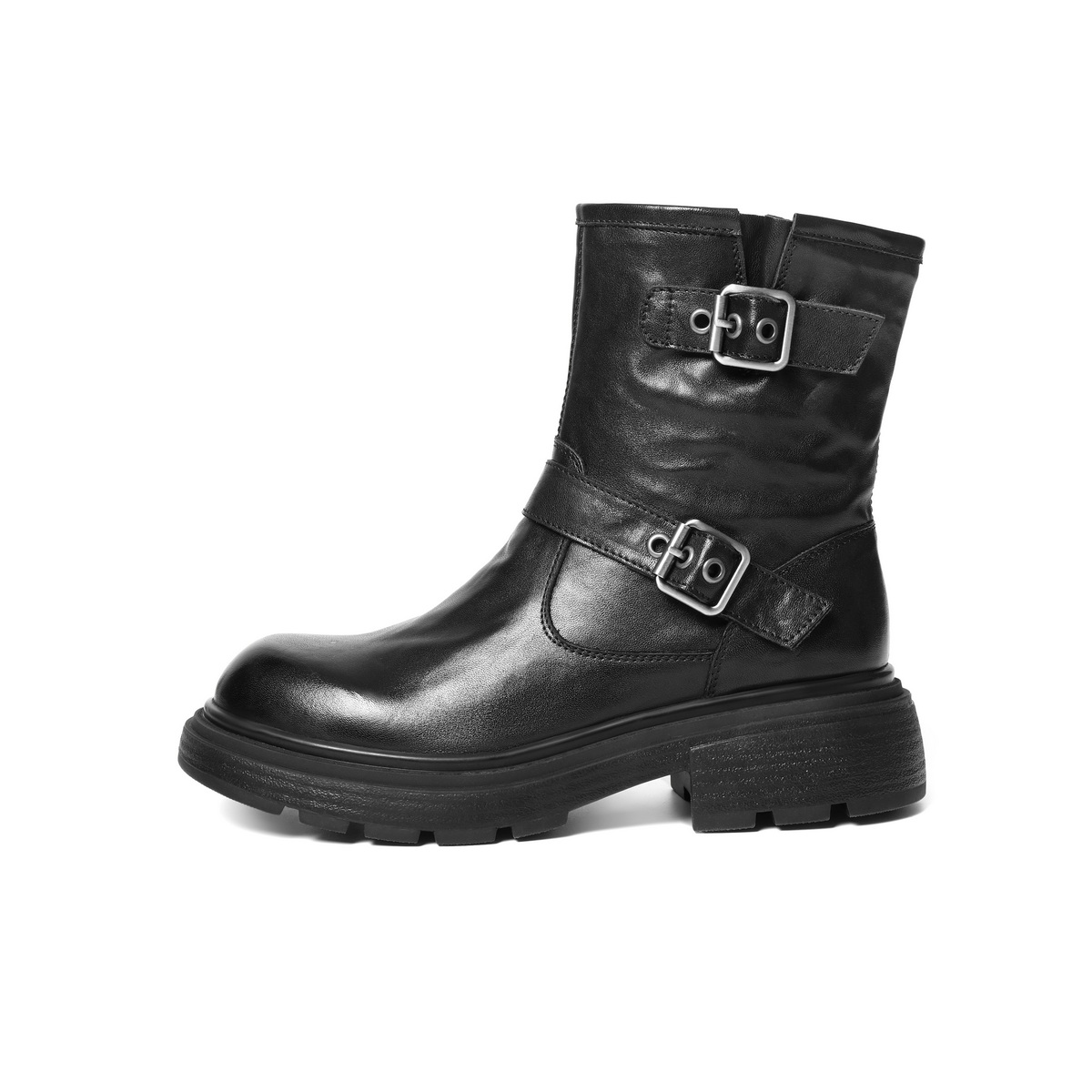 百丽复古抓皱马丁靴女2025冬新质感真皮时尚皮带扣短靴B2959DD5