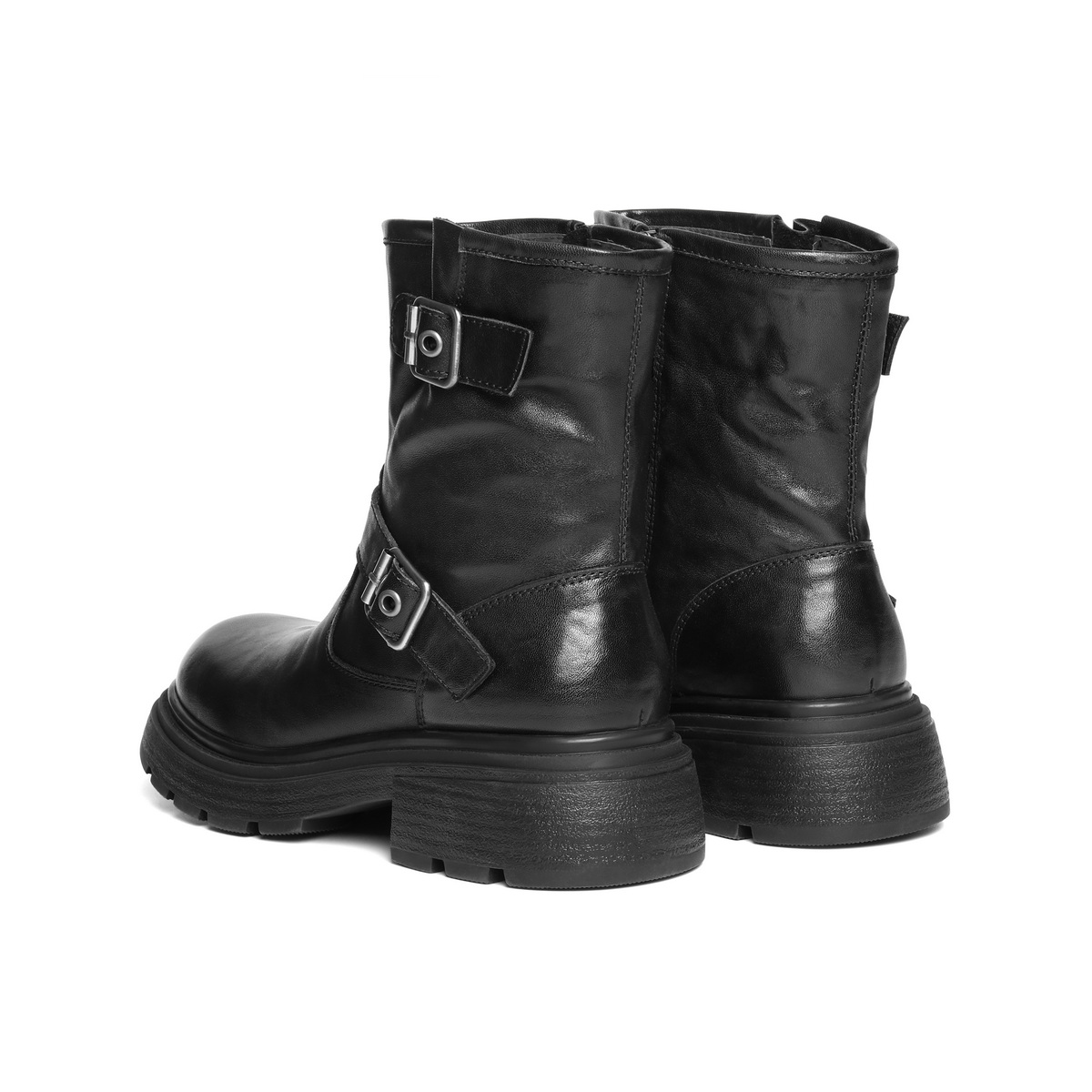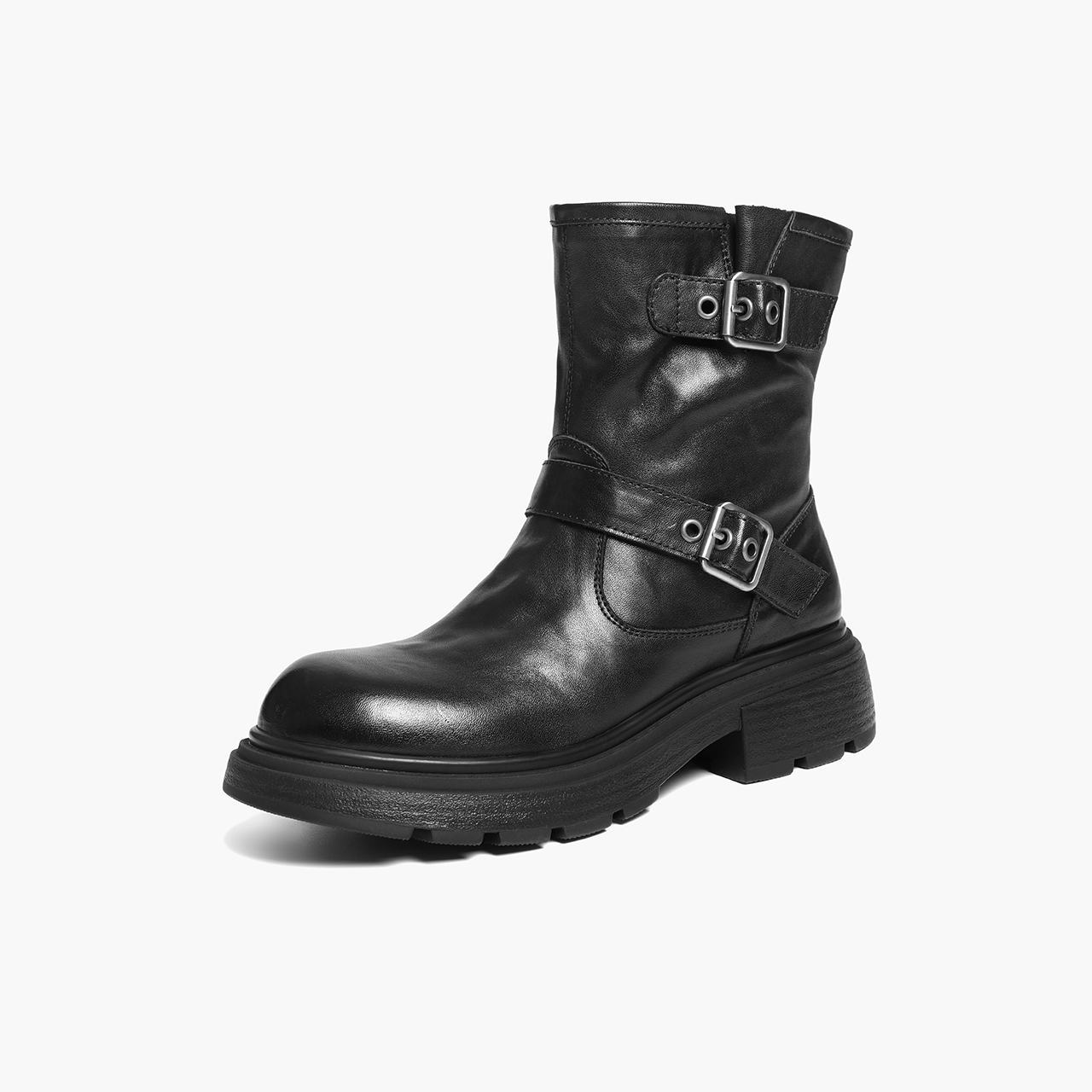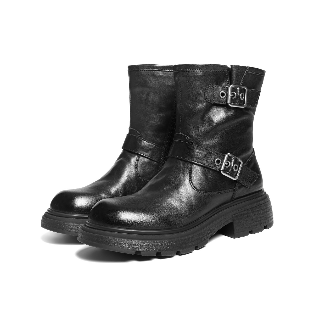 百丽复古抓皱马丁靴女2025冬新质感真皮时尚皮带扣短靴B2959DD5