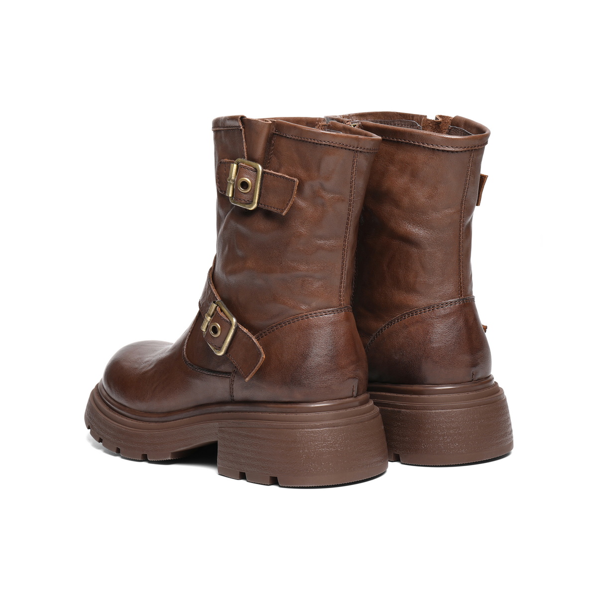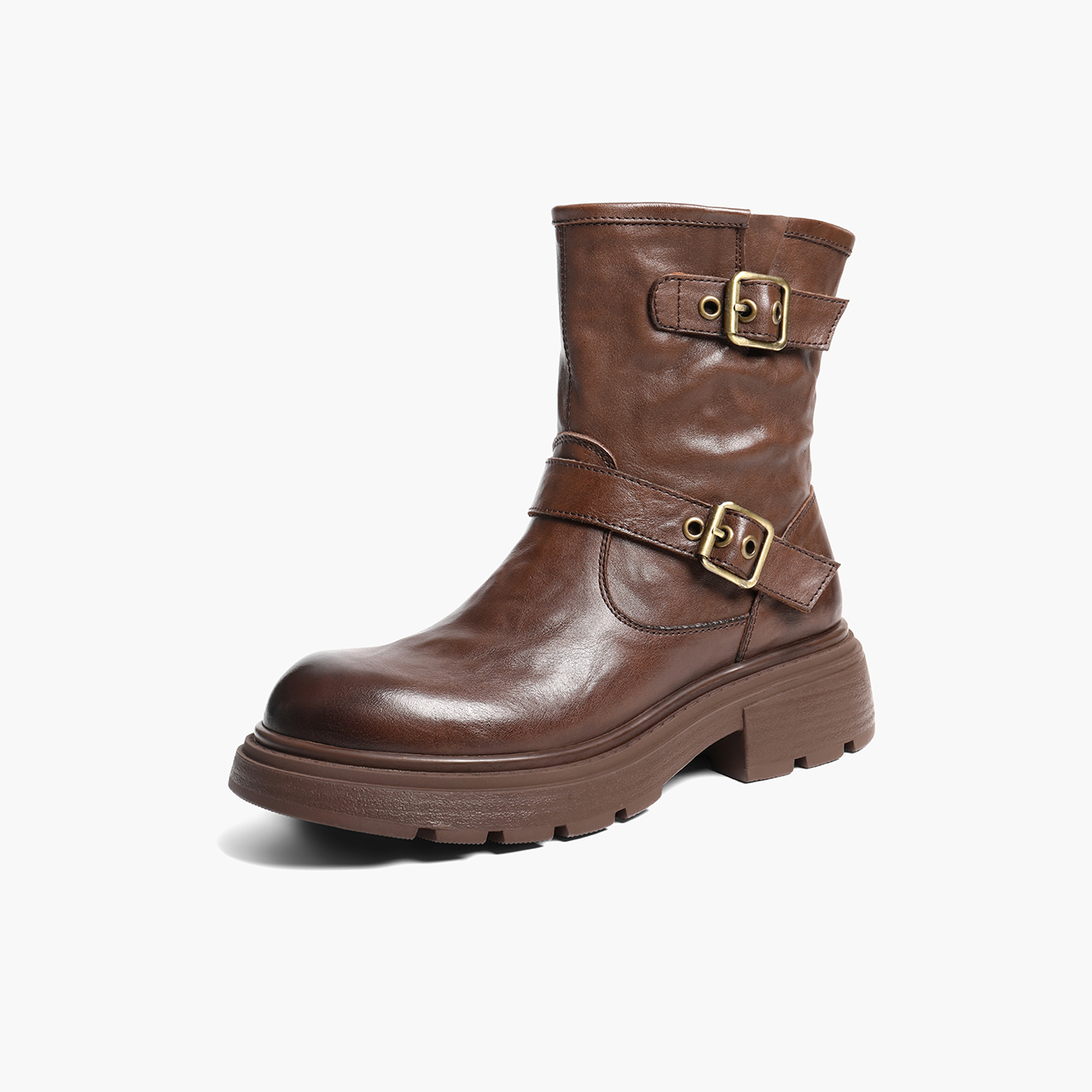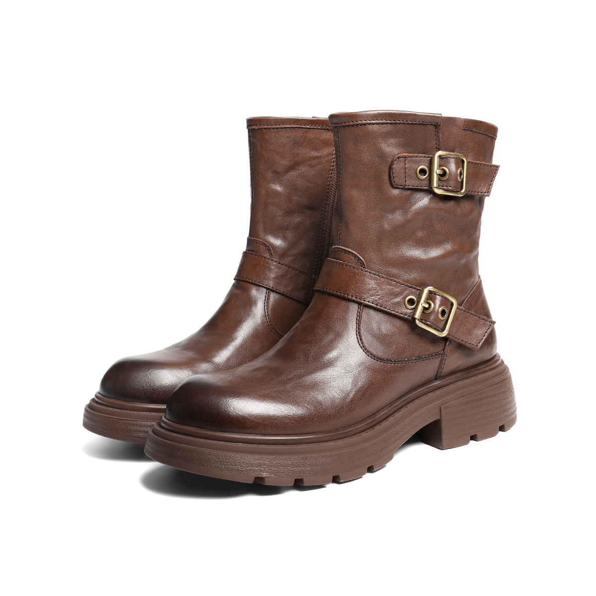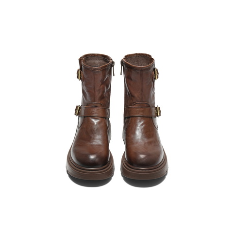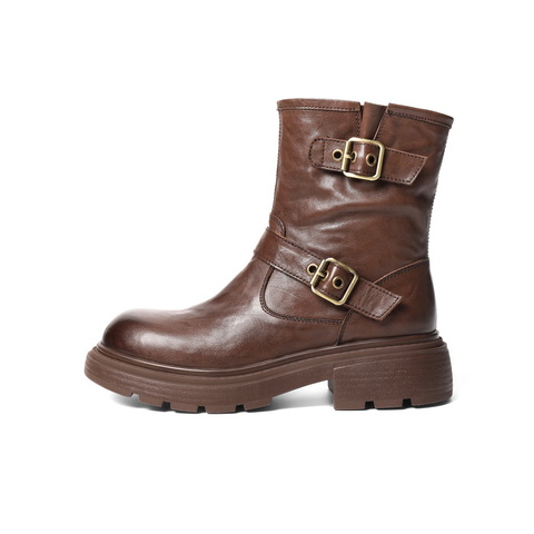 百丽复古抓皱马丁靴女2025冬新质感真皮时尚皮带扣短靴B2959DD5