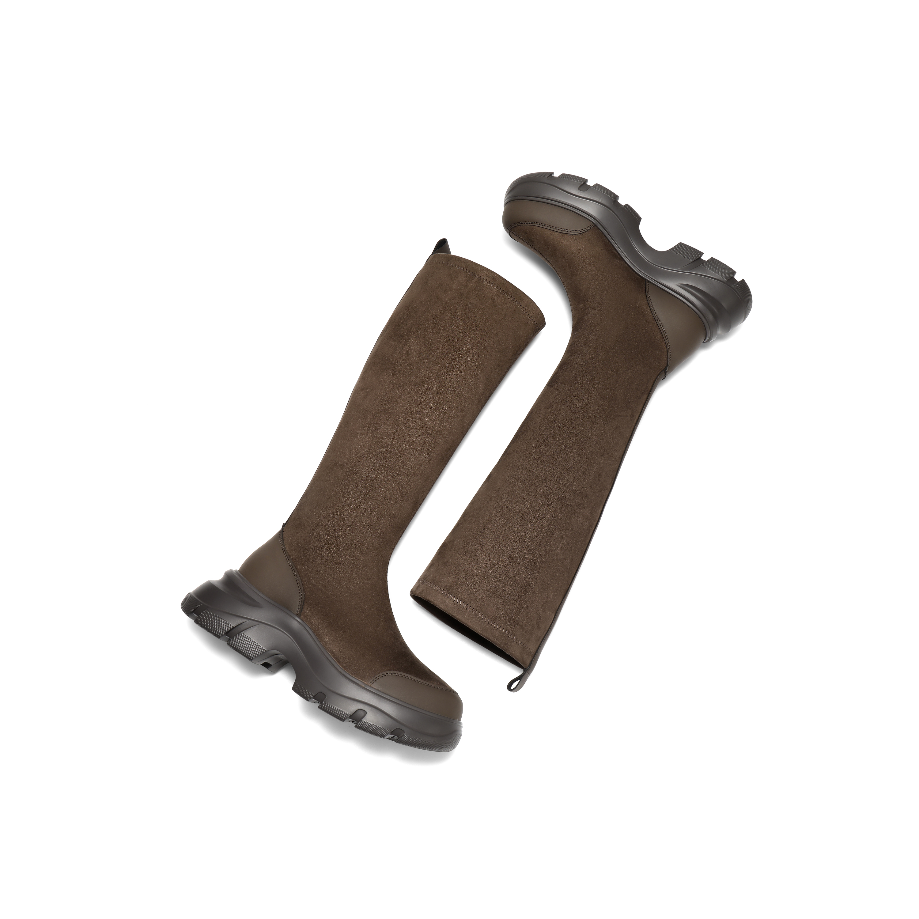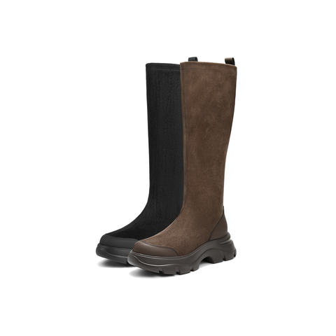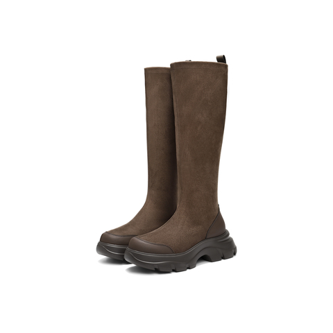 百丽复古时尚绒面弹力靴女2025冬新厚底防撞头弹力高靴E4V1DDG5