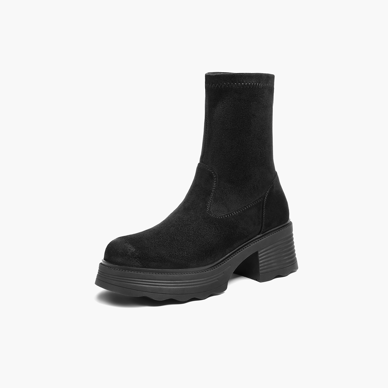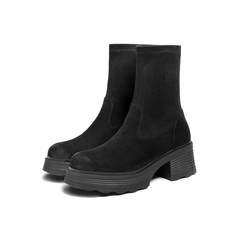 百丽复古弹力靴女2025的冬新商场同款粗跟增高休闲短靴E5G2DDZ5