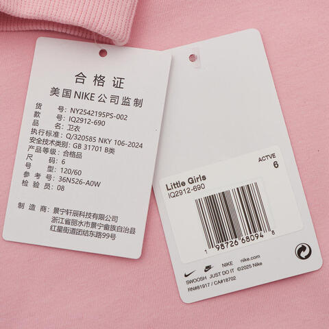 Nike KidsNike Kids2025女小童套头无帽卫衣针织无帽卫衣NY2542195PS-002
