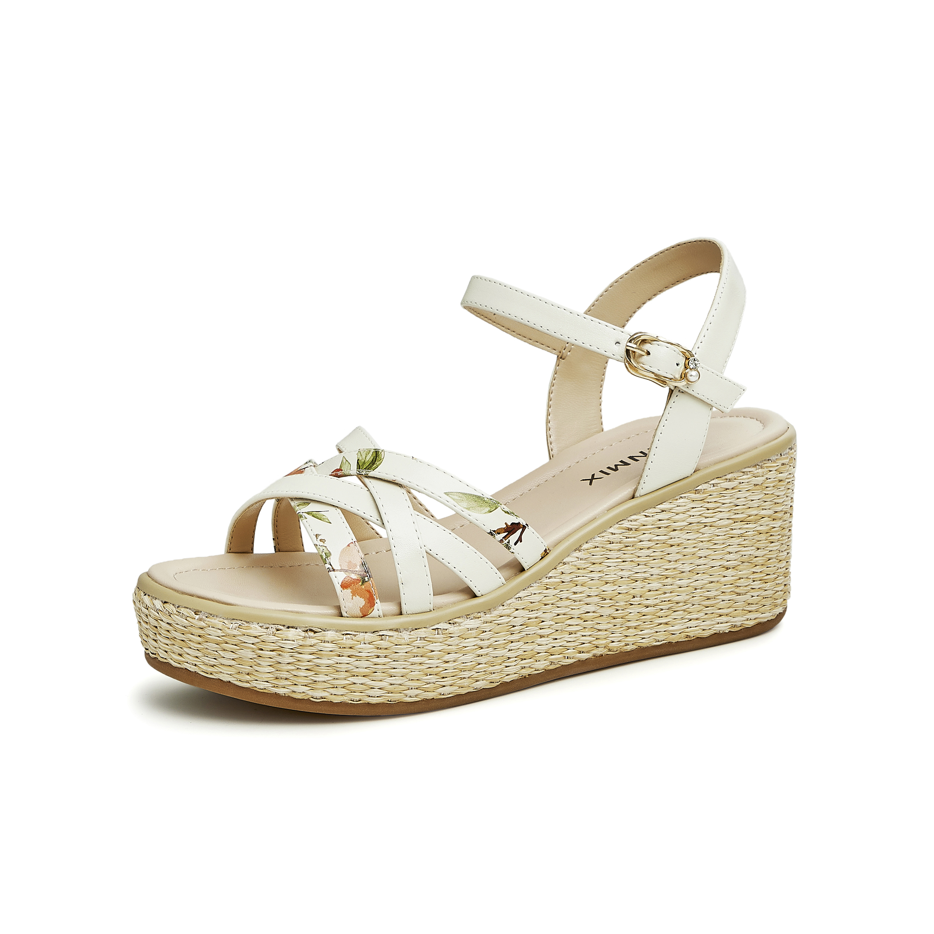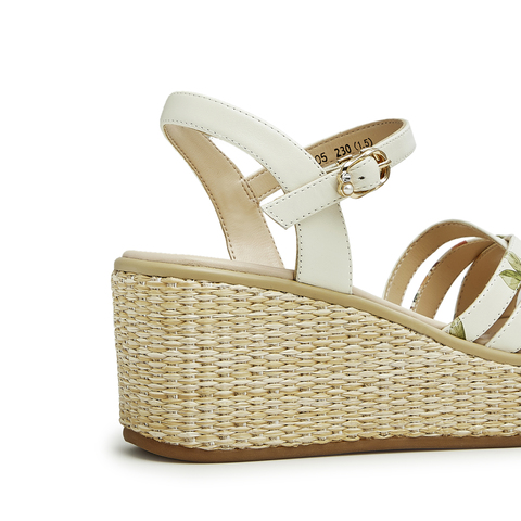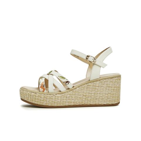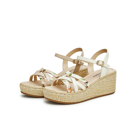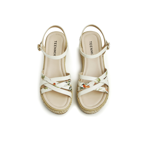 天美意2023夏新款商场同款坡跟文艺编织花朵一字带女凉鞋COO05BL3