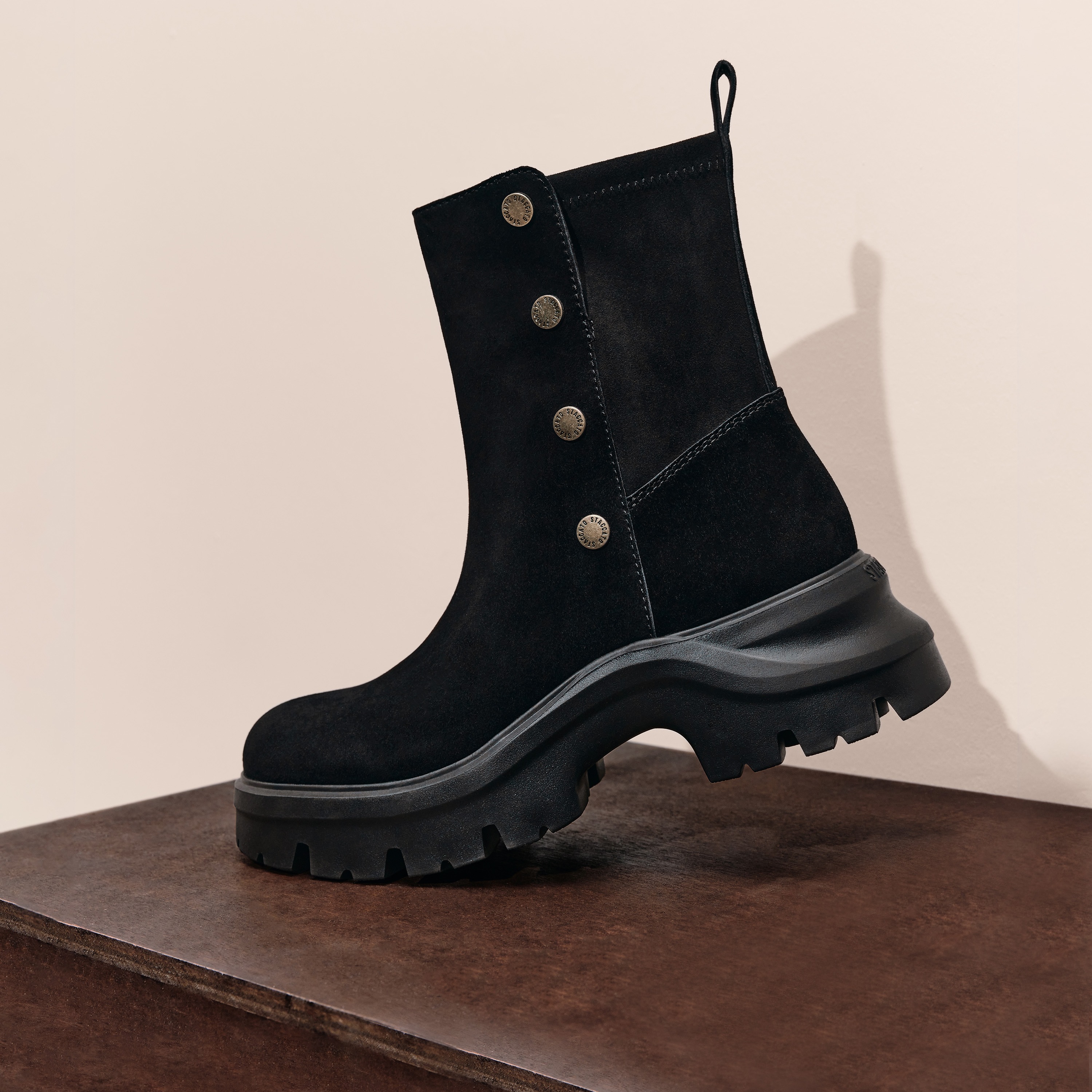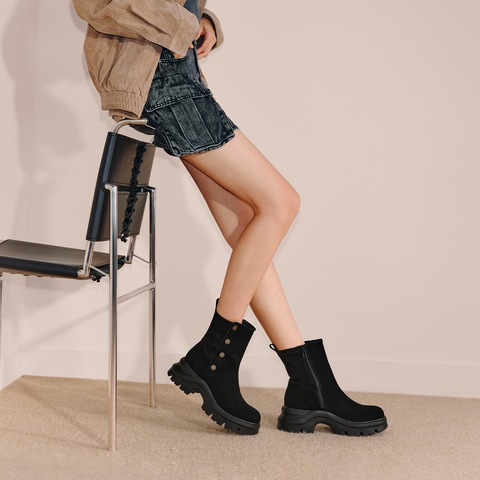 思加图2025冬季新款运动靴厚底增高中筒靴通勤黑色女靴子EJA05DZ5