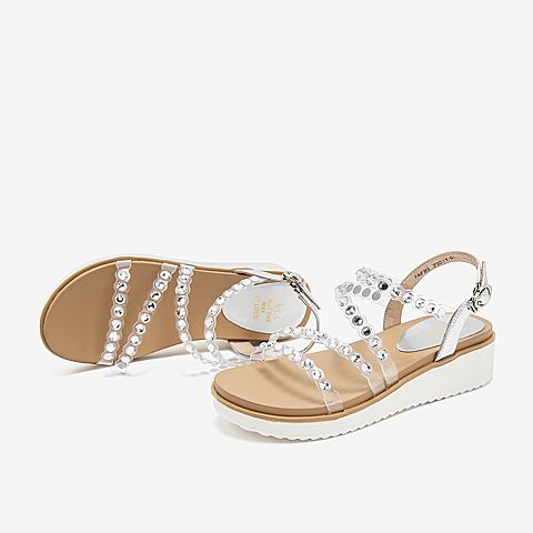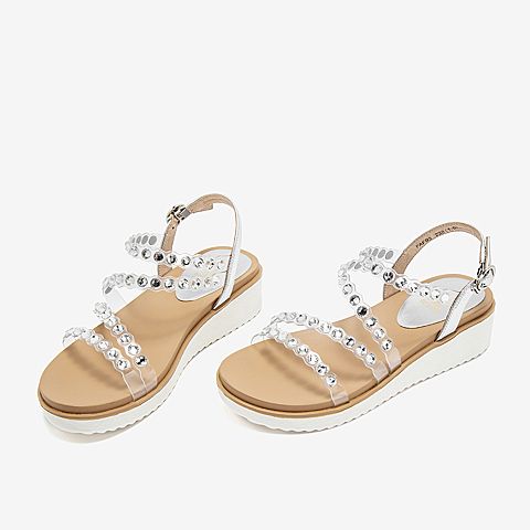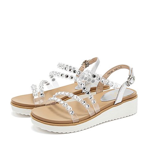 Tata/他她夏专柜同款白/银拼接水钻透明胶片休闲女凉鞋FAFB3BL9