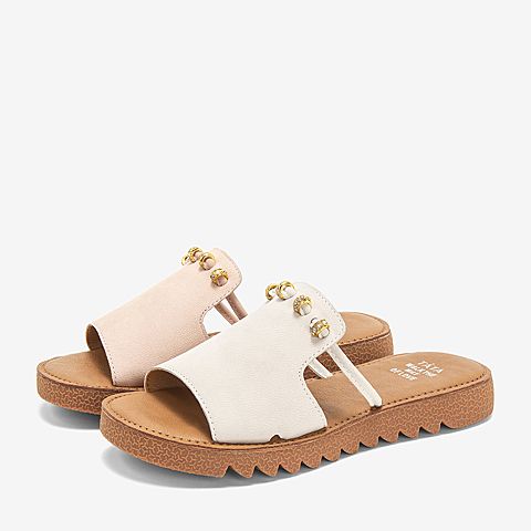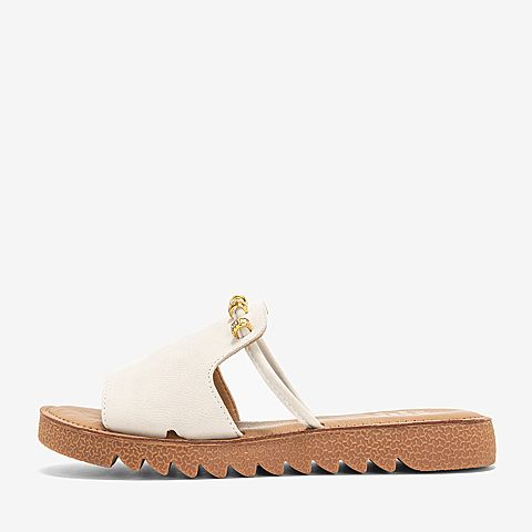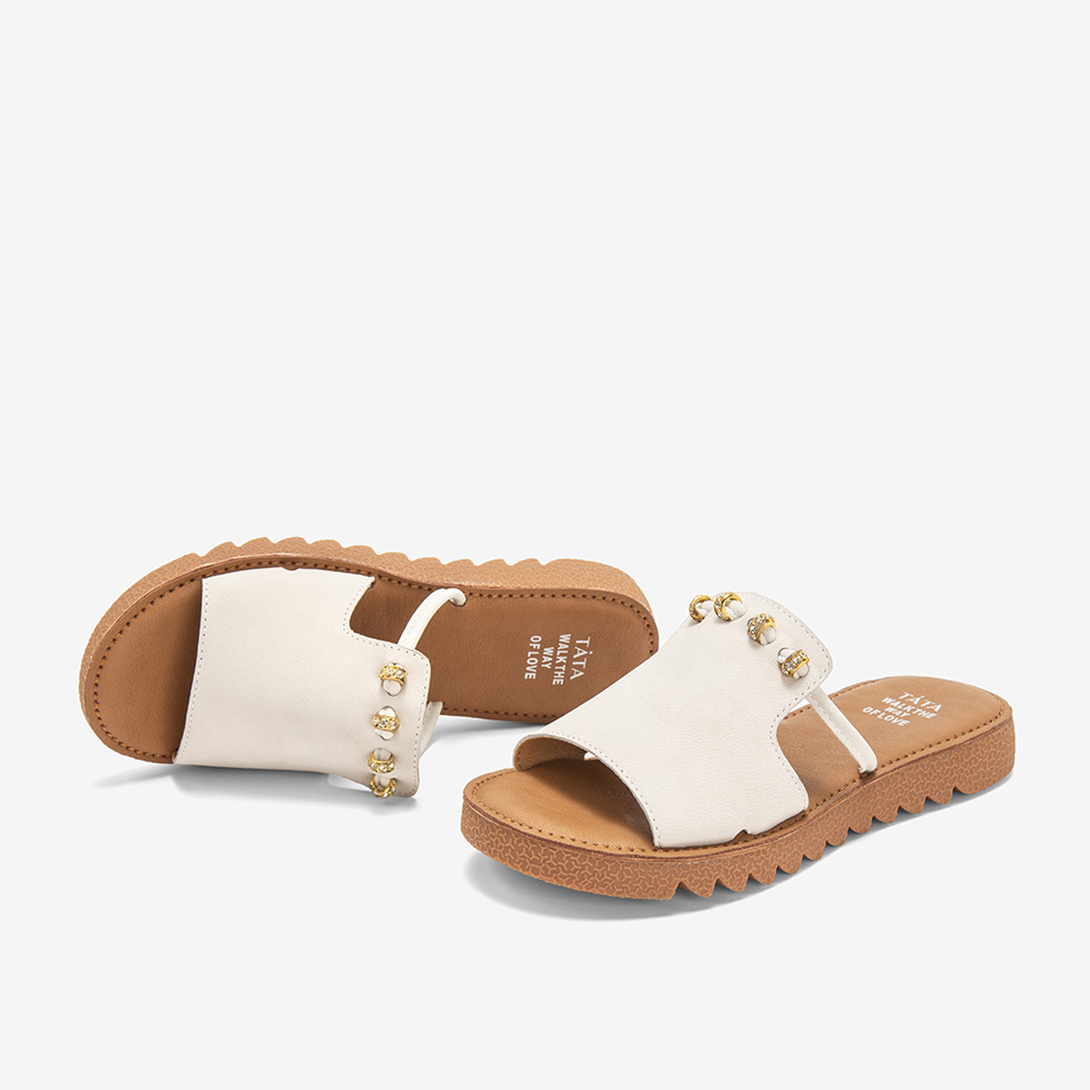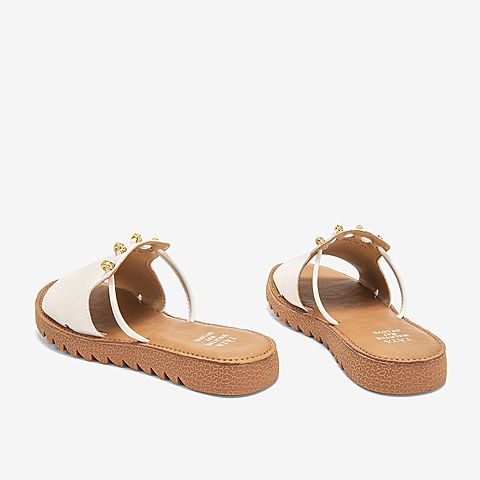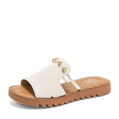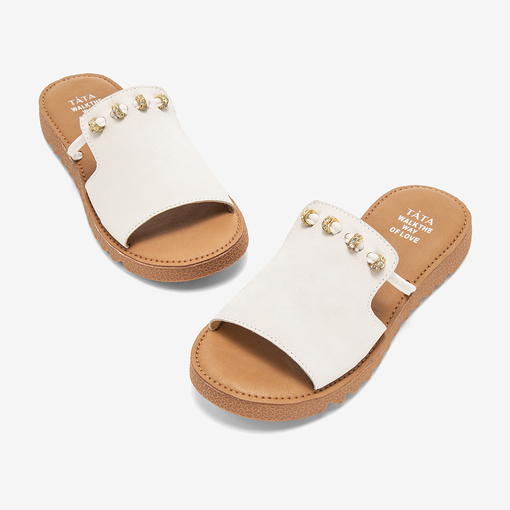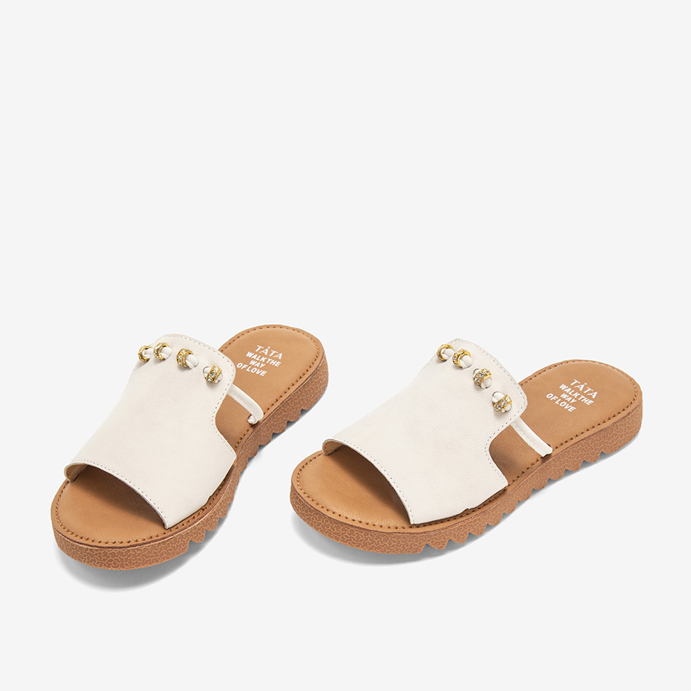 Tata/他她夏专柜同款米白拼接水钻平底凉鞋休闲女拖鞋IZF01BT9