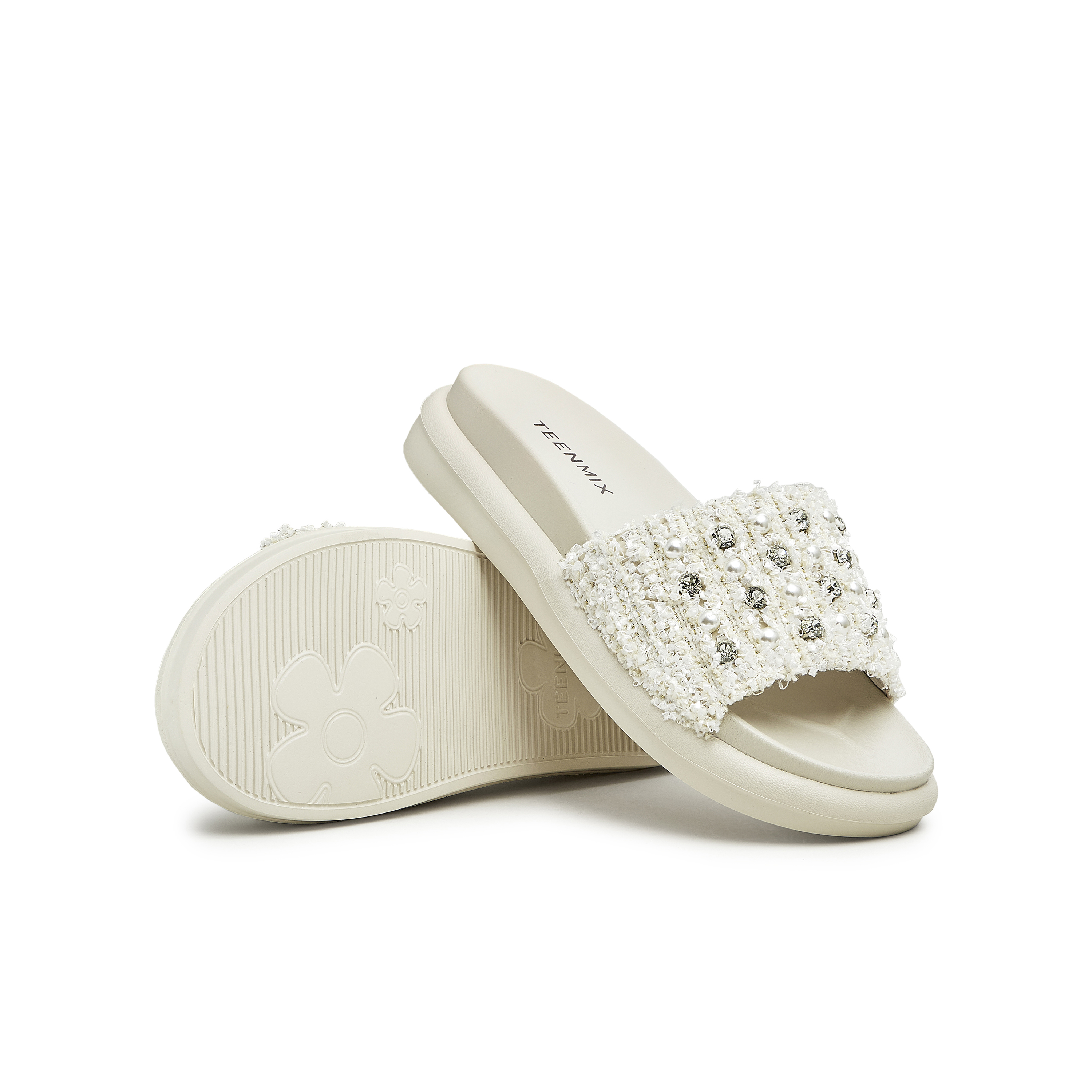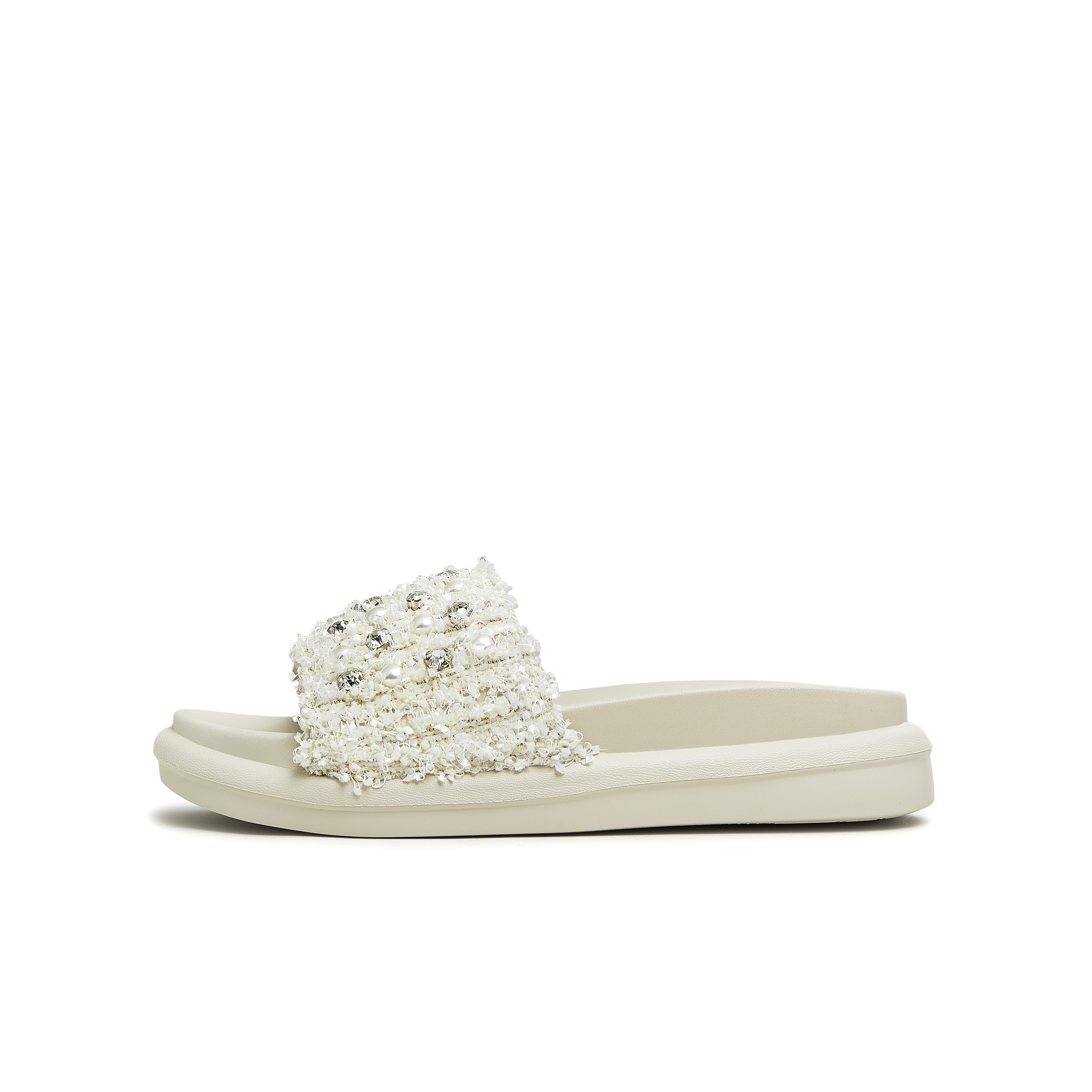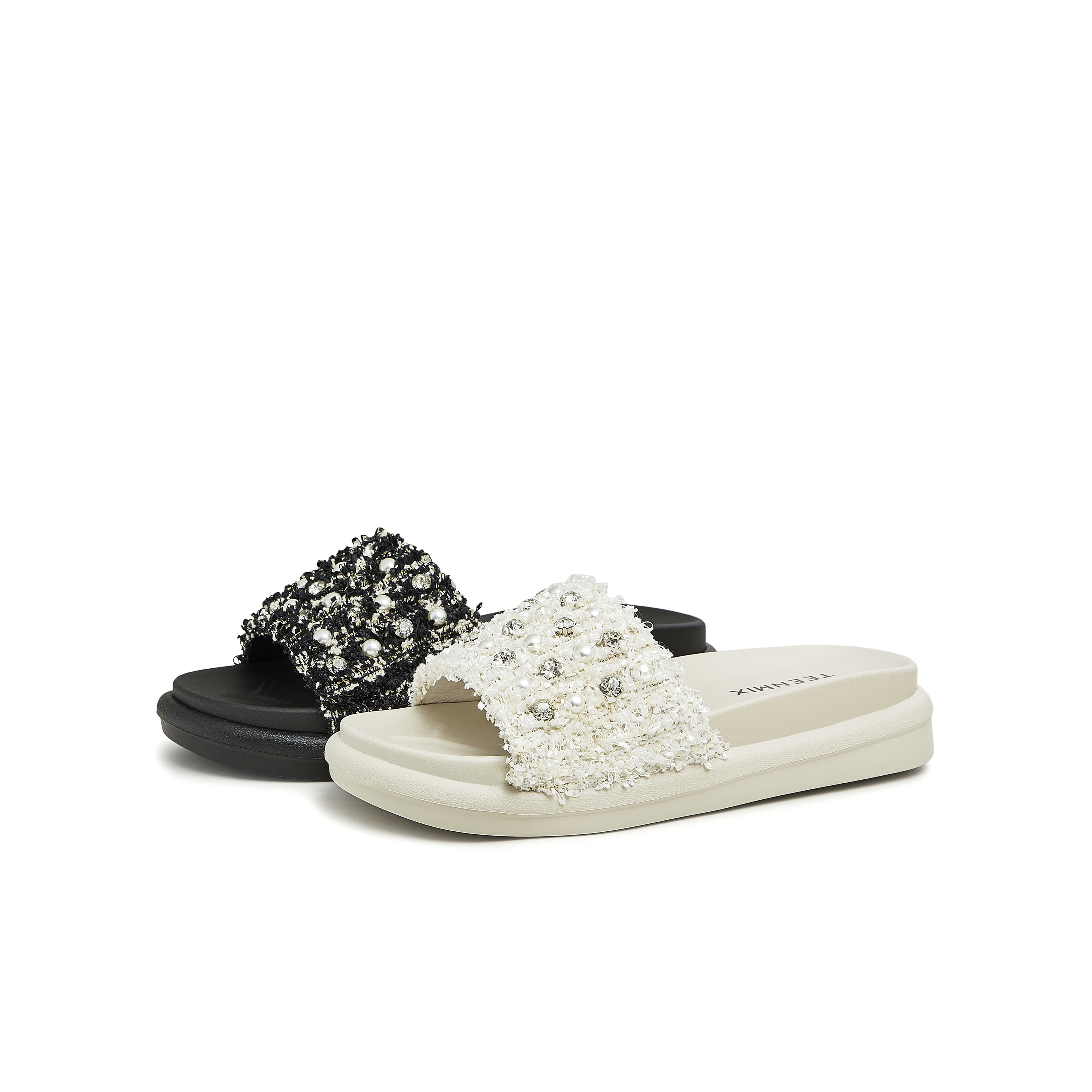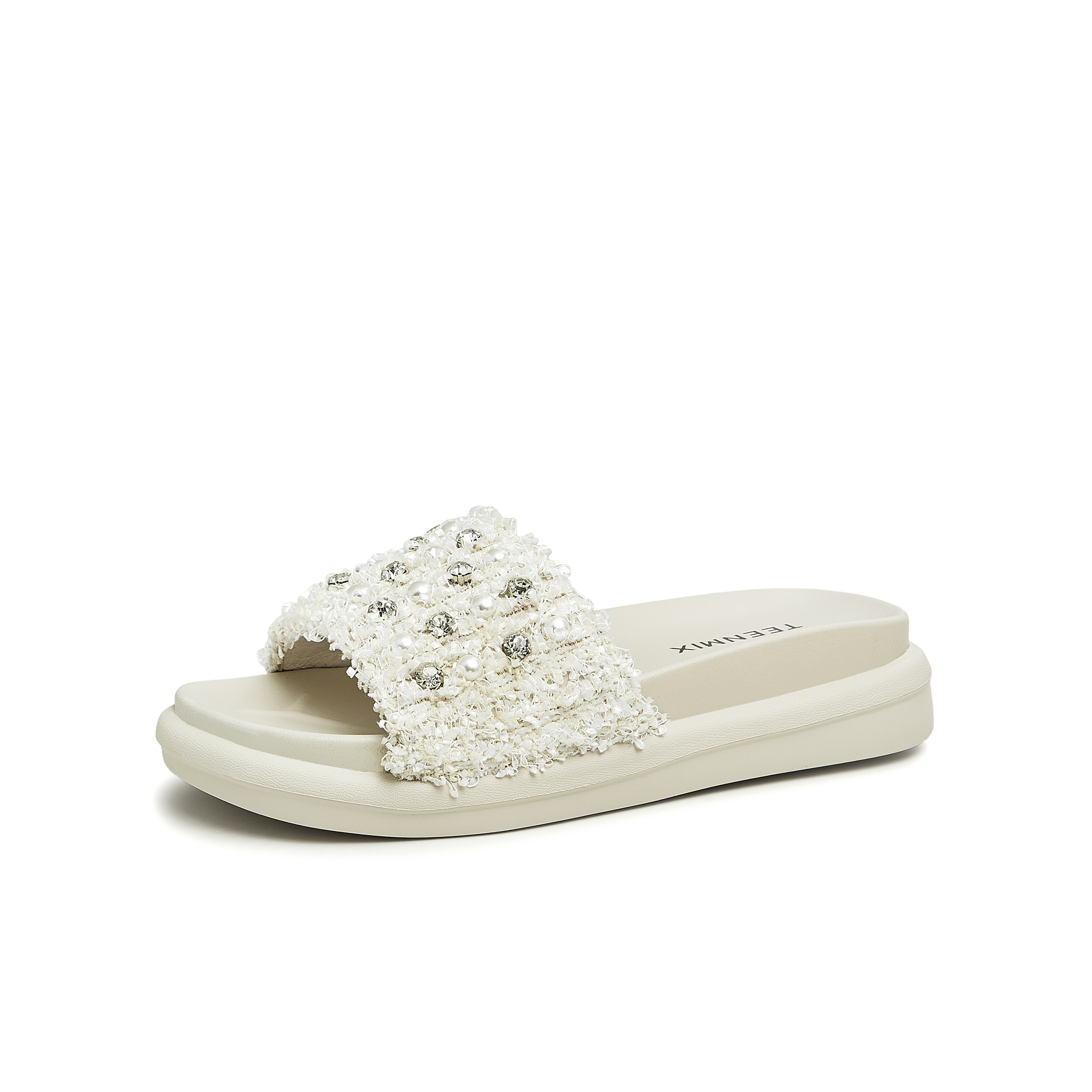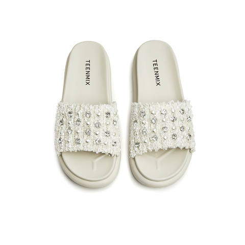 天美意2023夏新款小香风粗花呢布珍珠外穿休闲女凉拖鞋CTG12BT3