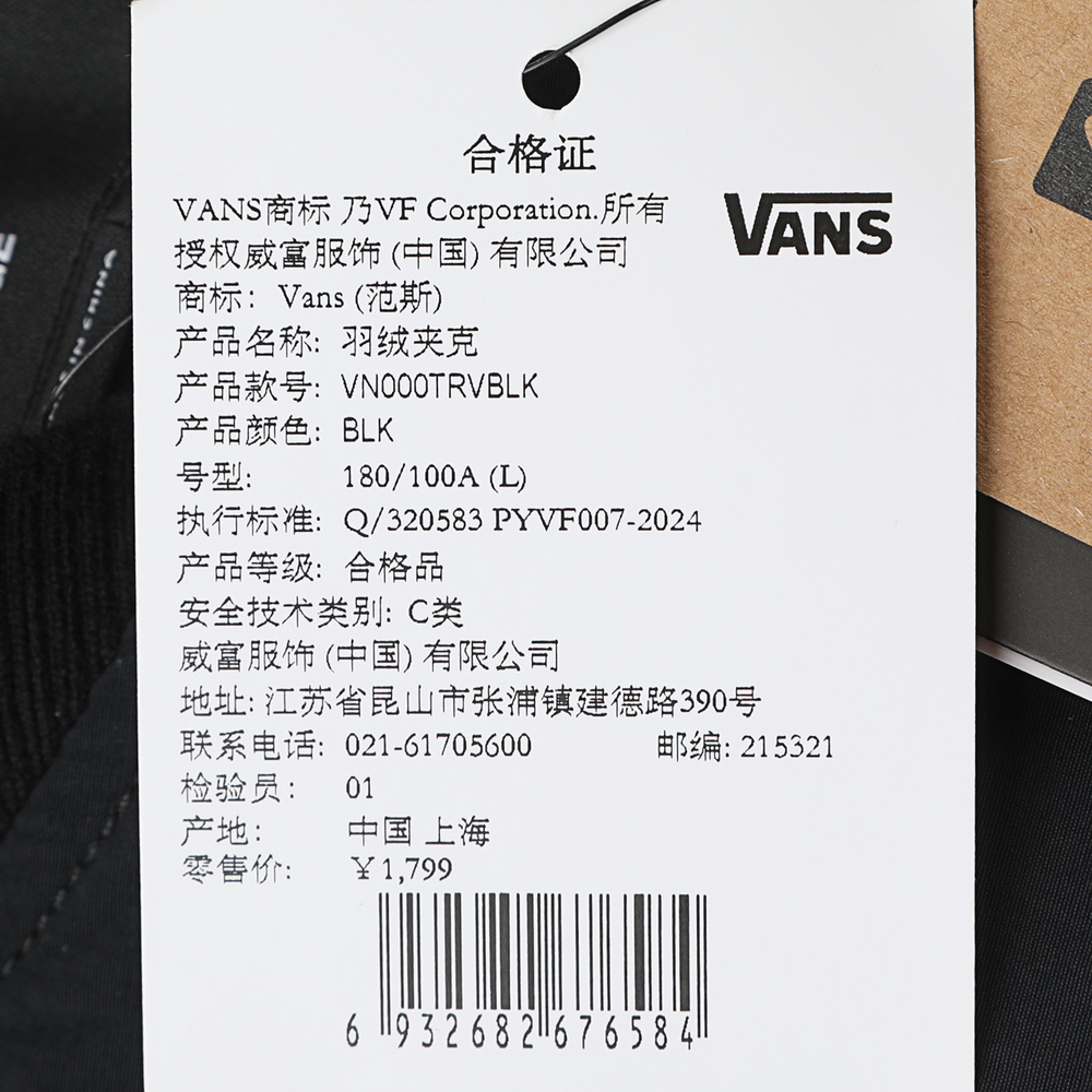VANS范斯2025男子TDC 2 WAY DOWN JACKET薄羽绒服-短VN000TRVBLK